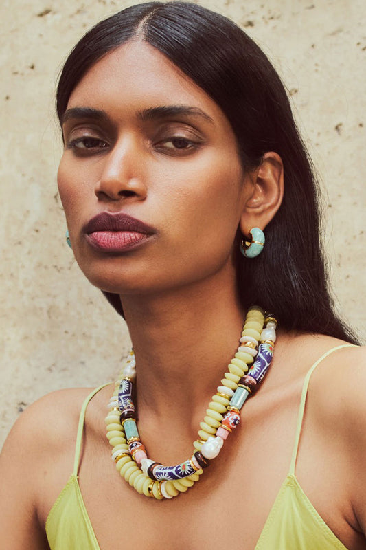 Featured in this collection are handcrafted ceramic beads glazed in peach and seafoam tones alongside aquamarine, chrysoprase and amazonite stones.