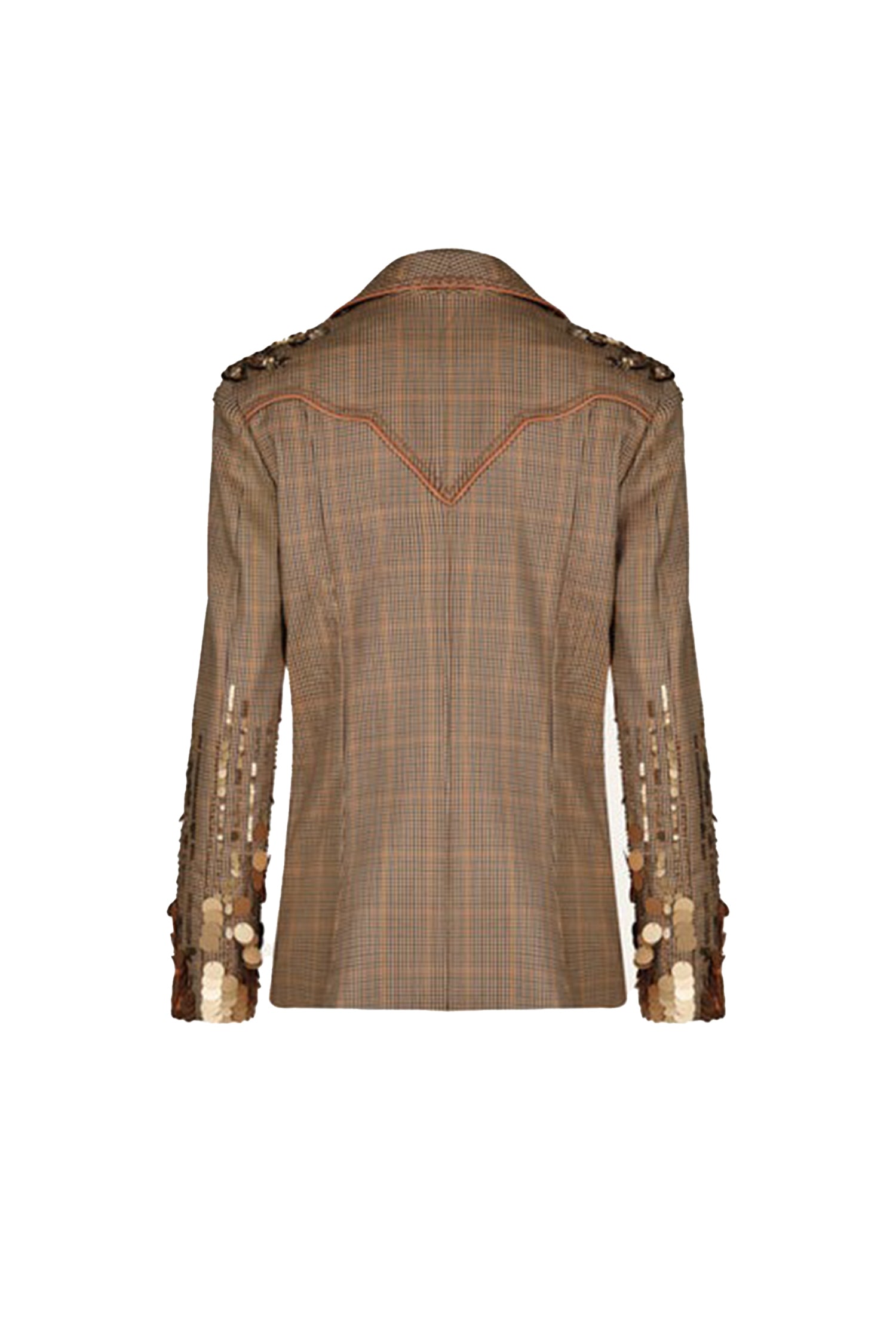 - Classic check pattern, accented by tonal sequins and beaded detailing