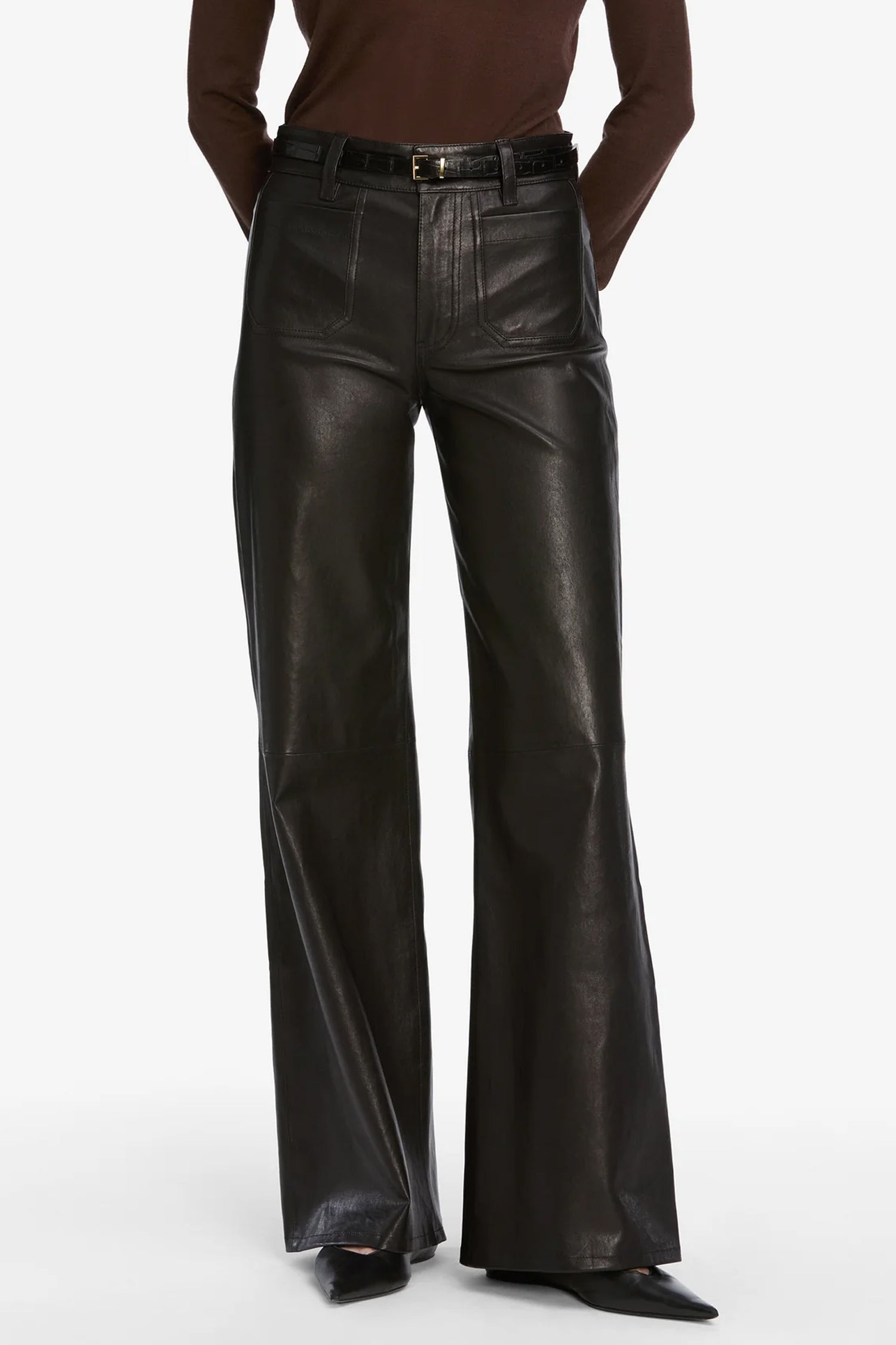 - Designed with a fitted hip, flared leg and chic front pocket details